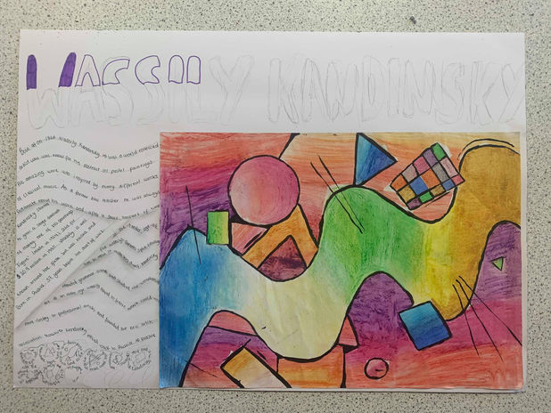 Looking to develop their skills of drawing and mark-making further through understanding different methods of mark-making and adding tone. Using colour theory and colour mixing to compliment this and develop their skills in painting using watercolour and oil pastels. Using the artist Kandinsky to be an example of such methods and using his creative process of using music as an example.